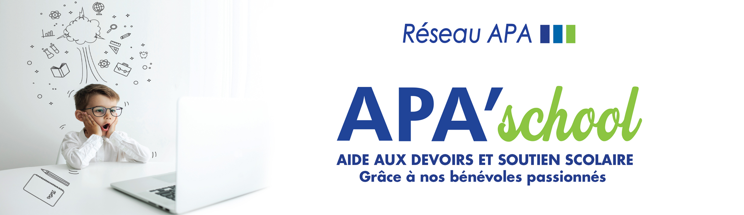 Pour vous aider à concilier votre vie personnelle, vos activités professionnelles et cet accompagnement scolaire, le réseau APA a initié APA’School ! Un service de soutien scolaire et aide aux devoirs pour les enfants de nos salariés, assuré par nos bénévoles passionnés.